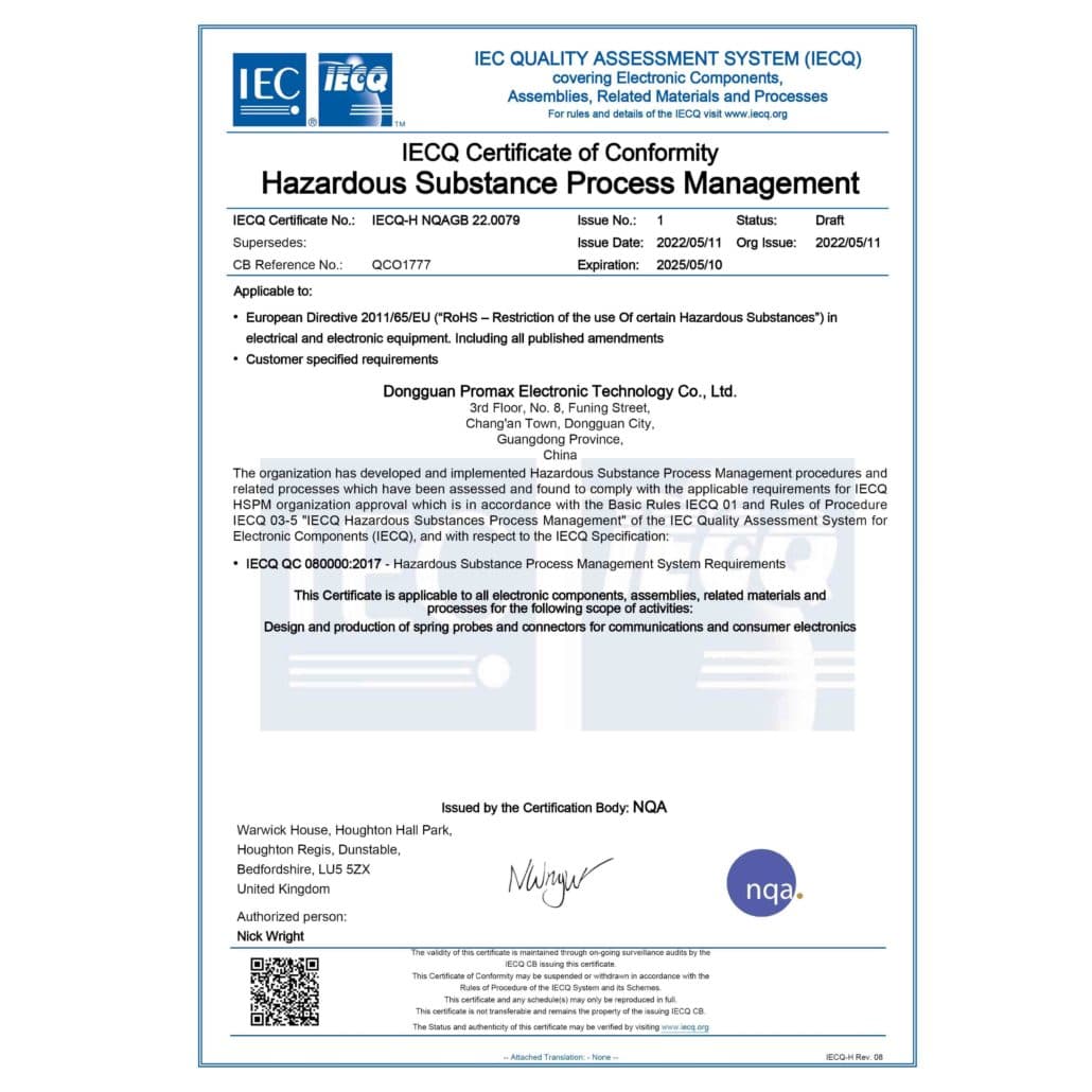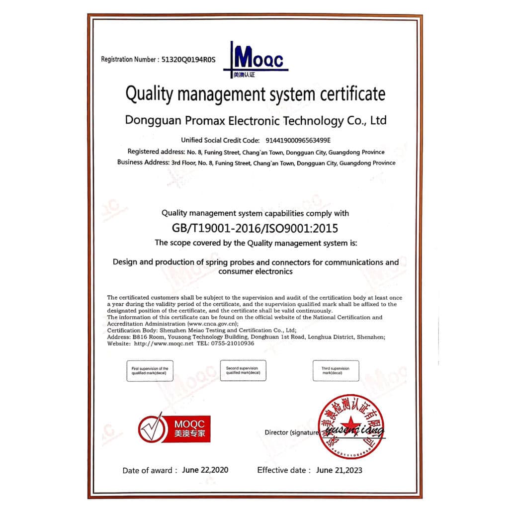 - Qualitätsvorteil: Dongguan Promax verfügt über moderne Produktions- und Prüfanlagen. Basierend auf den Kundenanforderungen entwickelt Promax Pogo Pin das beste Produktdesign, um den Kunden zuverlässige, sichere und wirtschaftliche Produkte zu bieten. Dongguan Promax hat die ISO-Zertifizierung für Qualitäts-/Umweltsysteme bestanden, sodass jedes an den Kunden gelieferte Produkt perfekt ist.